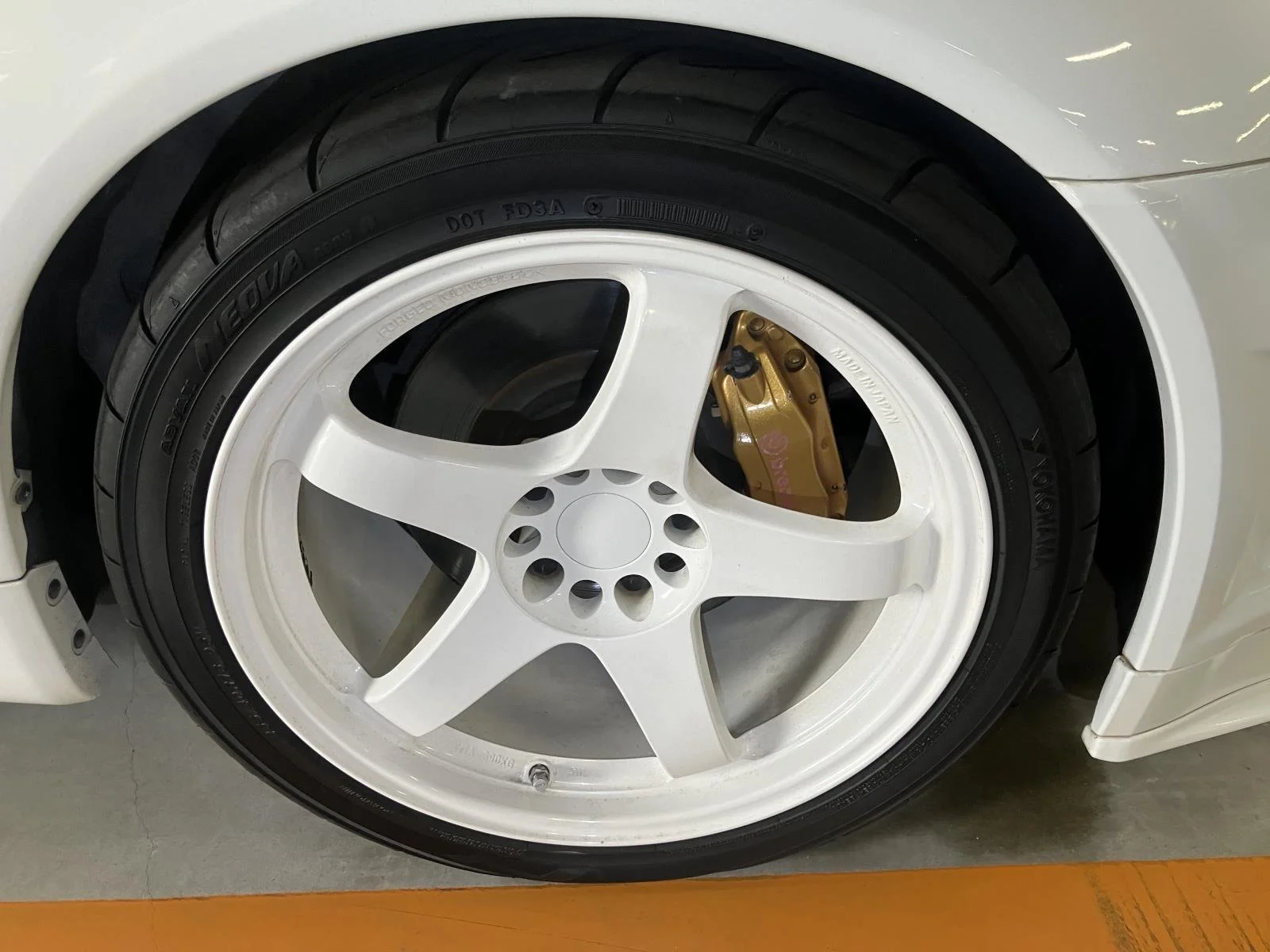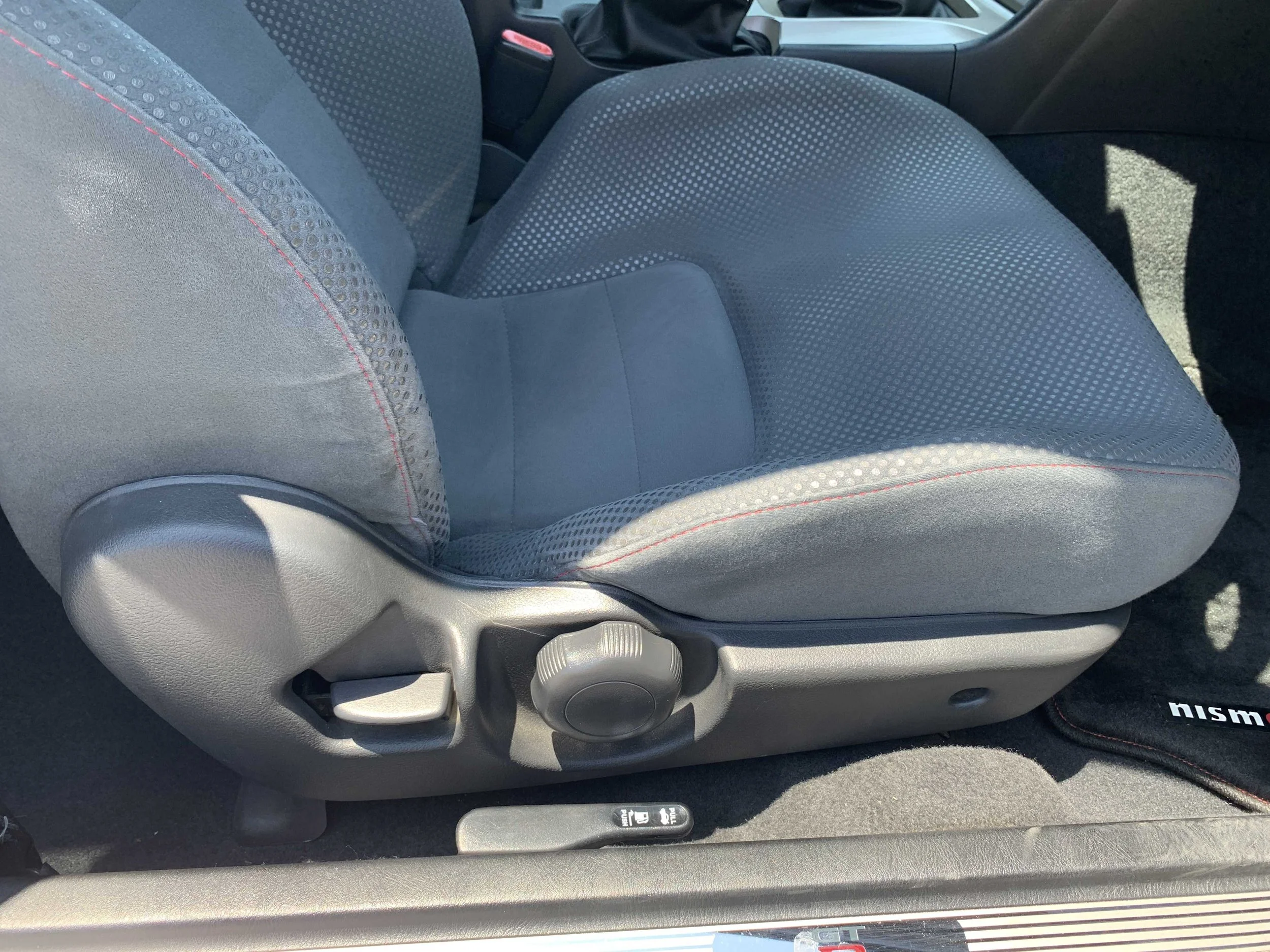 This white (QM1) GT-R V-Spec is one of 1222 "Series 1" examples. Its verified odometer displays 70,251 kilometers and it received a 4.5 grade. Modifications include a NISMO exhaust system, a NISMO S-Tune air filter, NISMO suspension, and 18-inch NISMO LMGT4 wheels.